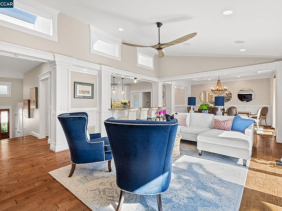 Breathtaking estate in the Orinda Hills offers 5,050 sq. ft. of luxurious living on over ½ acre of landscaped grounds featuring owned solar, hardwood floors & custom millwork. From the foyer, ascend to the expansive great room anchored by a well-appointed kitchen w/ Thermador appliances, 6 burner gas range w/dual ovens, Hoshizaki ice maker, island, prep sink, built-in SubZero wine fridge, bar seating, walk-in pantry & powder room. Open layout flows into the living & dining areas leading to a spacious deck.Main level offers a family room & ensuite bedroom w/outdoor access-ideal for family & guests. Also find an office & laundry room. Upstairs the primary suite w/ private deck provides an elegant retreat w/ fireplace, dual walk-in closets & lavish ensuite featuring a jetted tub, dual vanities & multi-head shower. Three additional upstairs bedrooms- 1 w/ ensuite bathroom & walk-in shower, while the other 2 share a bathroom. A laundry closet on the 2nd floor accessible to all bedrooms. Outside find a spacious deck w/ 2 fire pits, stunning sunset views, lush lawns & sports court. Enjoy owned solar, 2 tankless water heaters, smart home features, WiFi mesh, upgraded electrical, newer roof, electric car charger & backup generator. Close to downtown Orinda, BART, parks & top-rated schools