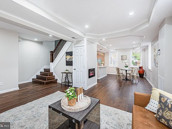 BEAUTIFULLY DESIGNED END OF GROUP RENOVATION WITH 3 FINISHED LEVELS & A DETACHED GARAGE! Features include an open floor plan, wood flooring throughout, a spacious living room and dining area with crown molding and an electric fireplace, an island gourmet kitchen with ss appliances & Quartz counters, a convenient main level half bath, upper level Primary bedroom suite with a full bath with double vanities and 2 additional bedrooms with a hall bath, a finished basement with a family room, an inviting covered front porch, a private rear patio that's great for entertaining, and a detached garage with an additional parking pad!