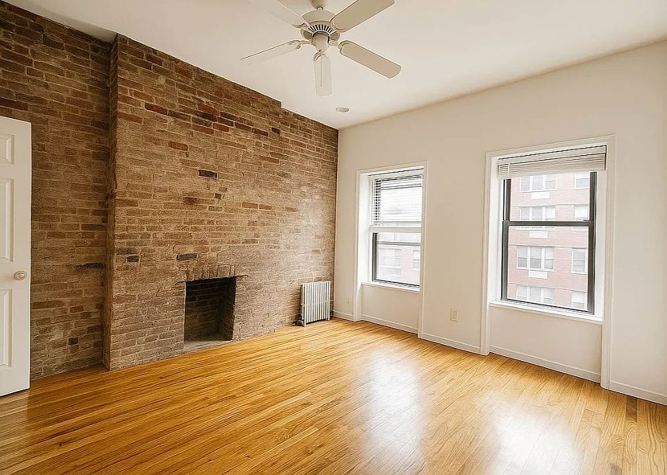 The spacious living room spans over 25 feet, providing ample room for living, dining, and entertaining. Each bedroom offers large windows, decorative fireplaces set in exposed brick walls, and custom closets.