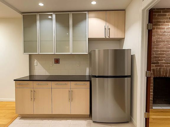 The kitchen is equipped with updated appliances, abundant counter space, and ample cabinet storage. The updated bathroom features a glass-enclosed shower and radiant heated floors for a touch of luxury.