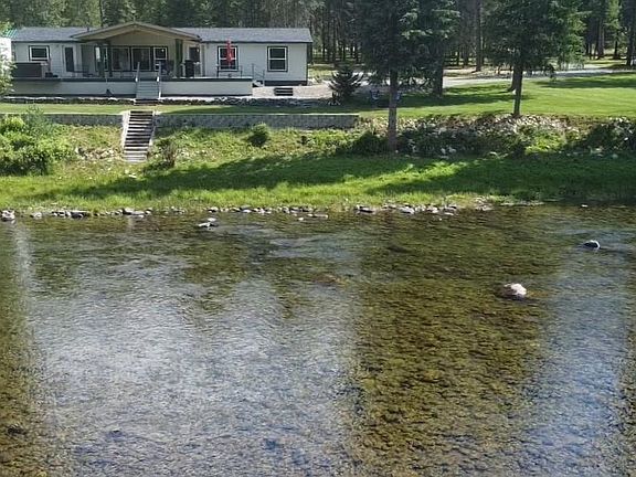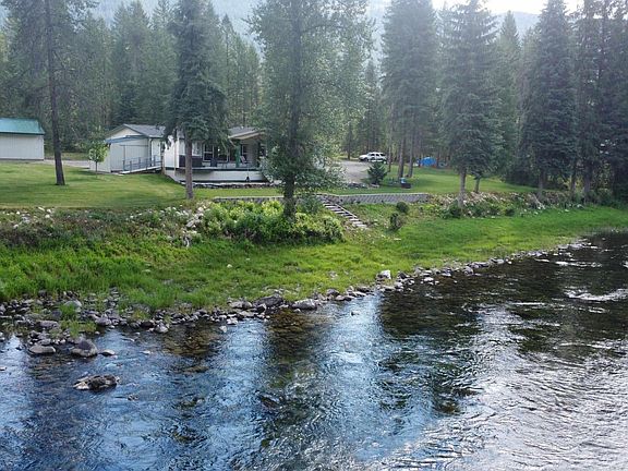 The Moyie River runs along the entire front yard only ~50ft from this 1650sqft, 3bed, 2bath home on 3.6ac. The Kootenai NF on the opposite side of the river adds to the spectacular view w/the amazing grandeur of the 6000ft high Queen Mt. Step from living rm or master to the huge deck, sit in the hot tub & enjoy the serene ambiance of nature w/elk & deer grazing beside the river. The master has ensuite bath w/garden tub, separate shower & water closet. Cherry cabinets adorn the kitchen w/it’s large island/breakfast bar & an ~13X5 walk-in pantry. Kitchen is open to dining & living rms where large windows display the soothing ripples of the peaceful river. The home is on-grid but has a full house automatic Generac backup generator in case of a power outage. A central heating furnace very rarely comes on because the Lopi wood stove heats the home w/very little supplement from the furnace. There is a 12X16 shop w/lean-to. Lived in only 2 years, & move-in ready it’s a low maintenance, beautiful home in an amazing location. All furnishings may convey with home.