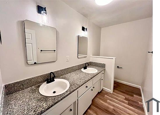 Silver fixturesGranite countersVinyl flooringNavy blue kitchen cabinetsDouble sinks in bath