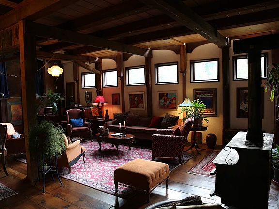 "One With Nature" Cedar timber frame home on 25ac designated timber land support wild life habitat. Country, artistic, environmentally friendly living is a way of life here. Natural wood throughout including 11" plank white pine floors. 3 wood stoves, theater stage, studio loft, natural light, RV hoot ups w/septic, 560sq ft guest cabin, green house and farm shelters, 2 ponds, are only the beginning of the story of this secluded property boarding state land.