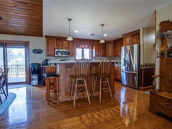 Beautiful log ranch home on a park like setting with all one floor living. The tree lined paved drive brings you to 7 private acres with mature trees and beautiful landscape. Located between Penn Yan & Geneva, this sprawling ranch has newer kitchen, open floor plan to dining, and large living room. Beautiful rock gas fireplace centers the room. 3 large bedrooms on first floor with 2.5 baths, including a large master suite, 2 car attached garage and first floor laundry. The walk out basement has 2nd kitchen, living room, workshop, and potential for additional bedrooms. 2 outbuildings, including one large pole barn built in 2010 and another log sided. Large back deck overlooking back yard and Kashong Creek. Impeccably maintained with so much to love. Offers presented on March 15th at 12pm.