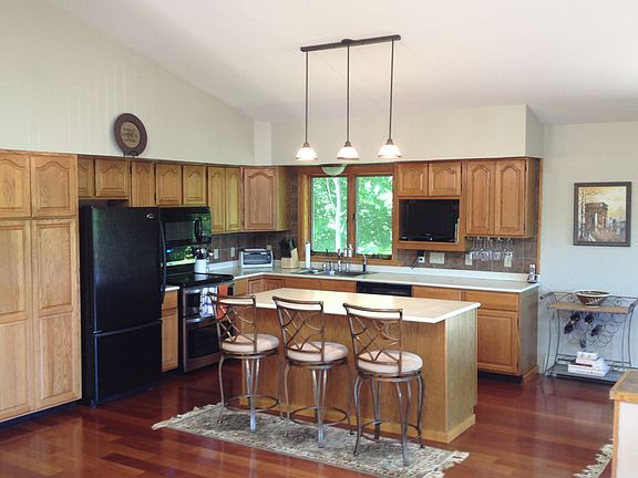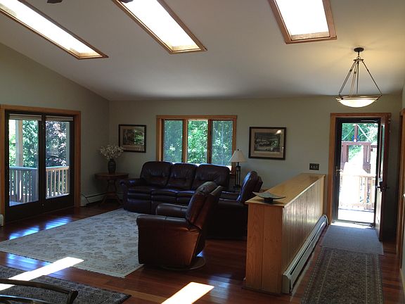 Enjoy lake views from this private home on 4.4 acres, along w 15' lake front parcel for a dock and boat! 2100 square ft w additional sq ft in the finished walk out basement. Great room includes living, kitchen and dining room w vaulted ceiling, Brazilian Cherry hardwoods, wraparound porch. Master bedroom w bath, walk-in closet and private porch overlooking ravine. Finished basement w family room, extra bedroom w Murphy bed, rec room w wood-burning stove. New roof in 13, exterior painted in 14, a/c in 12, tankless hotwater. Plenty of outdoor living to entertain in the summer months!