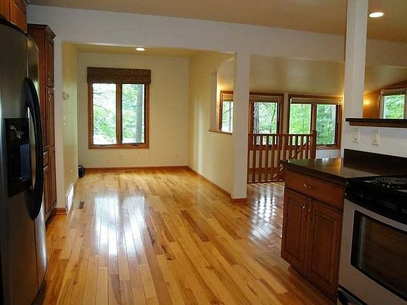 Completely remodeled from top to bottom, this year-round property would make a great home or getaway. The spacious, open concept living areas feature a gas fireplace, hardwood flooring & lots of lake-facing windows. The kitchen has solid surface countertops, beautiful cabinetry & stainless steel appliances & adjoins the dining area. A master bedroom suite overlooks the lake & has a full bathroom. Completing the main level is a half bath. The mostly finished lower level offers a nook with an egress window where a 2nd bedroom could be completed. A large family room accesses the lower level walk out, & an unfinished room provides laundry, utilities & loads of storage space. There is a gradual slope to the lake & pier. Two-car & a 1-car garages, abundant landscaping & 2 sheds complement this home. Per seller, updates since 2007 include: floors, drywall, insulation, bathrooms, kitchen, wiring, windows, drilled well, water conditioner, shingles on home & garages. New septic installed-2001.