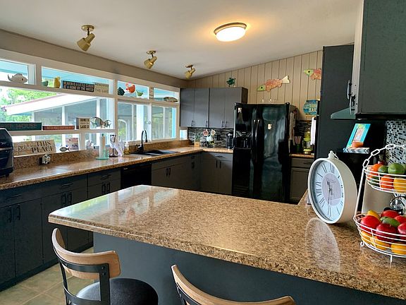 Live on vacation everyday! Beautiful lakefront 3 Br/ 3 Ba Twin Lakes home. Breathtaking views of the lake while working in the kitchen, eating in the dining area & relaxing with family/friends. This home has what you have been waiting for; inside comfort and plenty of outside room on the .7 acre lot to entertain, relax, & play. New double front doors, a/c unit, LVP floors/carpet, oven, dishwasher, counter tops, large bar, window treatments & remote controlled shades in living area. Also, freshly painted inside/out. Outside features include a screened cook area with seating, cook top, sink, ice maker and refrigerator. Also outside has a double tiered deck, new concrete walkway to an inviting fire pit & floating dock. Extra covered parking with a new double carport! 3rd bedroom currently being used as office. Enjoy fishing, boating and swimming in the clear water!