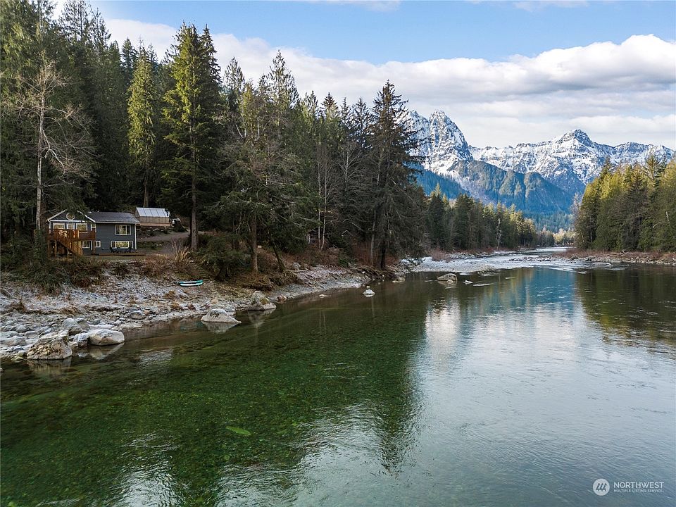 Rare opportunity to own a turnkey, tranquil oasis on the Skykomish River! Nestled on two large lots with expansive river frontage, this property is a MUST SEE! Launch kayaks from your backyard or simply enjoy the stunning river and mountain views from any room. A fully equipped 300 sq ft guesthouse offers space for hosting or rental income while the custom greenhouse is a gardener's dream. This beautifully remodeled cabin features vaulted ceilings, a cozy wood stove, expansive windows and a 3-bedroom, 1.75 bath layout blending rustic charm with modern luxury. Don't miss this extraordinary retreat!