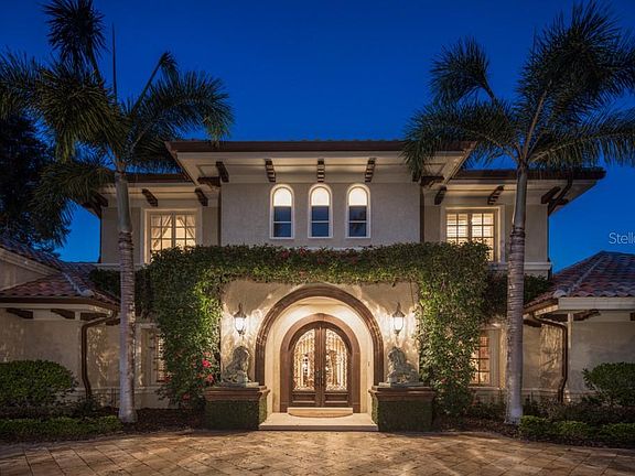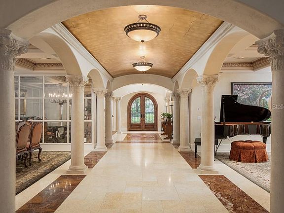 Poised on Isleworth Country Club Drive overlooking Eagle Pond and the 11th tee, this exquisite estate offers exceptional golf and water views within the gates of Central Florida's most iconic golf and country club community. Adjacent to the beautiful "Cloister Conspiracy" sculpture by Philip Jackson, the residence features an interior spanning more than 6,700 square feet with picture-perfect views of the surrounding landscape. Oversized wood, glass and wrought-iron French doors reveal a gallery entry where smooth marble floors sprawl beneath meticulously detailed ceilings adorned with chiseled millwork and dotted with stone columns. Presenting traditional architecture and design, the formal living and dining rooms with custom coffered ceilings lead seamlessly to the center-island kitchen and family room with an abundance of light. A range of impressive professional appliances and custom cabinets serve the kitchen, as well as a beautiful built-in bar and custom brick-lined wine cellar. On the first floor, two generous master retreats feature exquisite baths complete with dual vanities, garden tubs and walk-in showers with beautiful stone surrounding stained glass windows. The second floor is complete with two additional guest rooms and an office. The outdoor living area, which features a multi-level terrace and sundeck surrounding the sparkling pool, spa and water feature. Blending the finest finishes with an exceptionally beautiful setting, the estate offers the best in golf-front living.