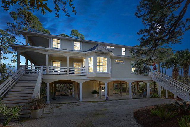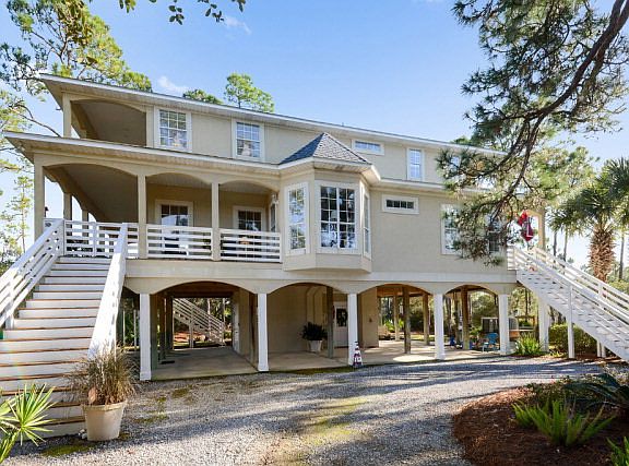 The quiet, open spaces and big covered porches of this waterfront home will bring you a sense of happiness and serenity. This island home rests in a slight curve of a peaceful cul-de-sac private street on Ono Island. The first level of the home features open carports with plenty of protected storage. The second level opens to a combination kitchen, living, dining areas, 2 bedrooms with a bath and covered porches. The third floor boasts 2 spacious bedrooms with separate private baths and porches. A simple wood path links the house to the covered boathouse and canal. Unwind, relax and experience a sense of restfulness in one of the quiet nooks of this happy, airy island home. Wonderful natural setting for birdwatching, reading or unwinding in a natural environment. Color me happy.