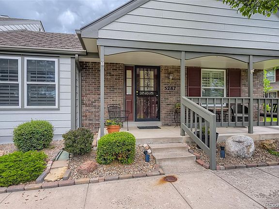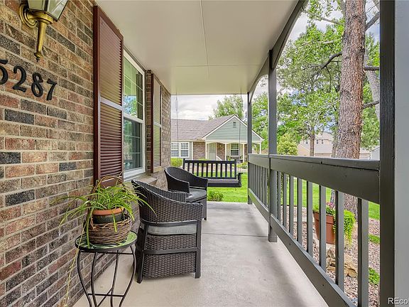 Updated and immaculate ranch townhome in popular Red Oaks in Governors Ranch neighborhood in Littleton. Mature trees and well-maintained common areas by an attentive HOA. This rare end unit has a beautiful location with covered front porch looking onto the grassy open space. Enjoy the Colorado outdoors year around in the large private fenced back patio area with retractable awing perfect for relaxing and great for pets, too. Walk into the large, bright, vaulted open living area with gas fireplace and ceiling fan. Hardwood floors and new double pane windows with custom window coverings, including plantation shutters, on the main floor. Updated eat-in kitchen with newer cabinets, granite counters and spacious pantry. Main floor master bedroom with door to back patio, double closets, and 3/4 bath. Additional bedroom on the main level with French doors and closet could be used as study or large dining room plus additional full guest bath. Professionally finished basement with huge recreation room including card game area and custom wet bar complete with refrigerator. Recreation room can double as guest area with two twin murphy beds, Also an additional non-conforming bedroom or study (no closet, but has an egress window) and a 3/4 bath plus laundry and storage area. Two car garage with opener, two service doors and attic storage is just off the patio. New furnace/ AC in 2019 and whole house attic fan, 50-gallon hot water heater in 2021. Walk to neighborhood swimming pool, multi-use tennis courts and trails. Shopping and Starbucks are just around the corner. Easy access to C470 and US 285 to get to the mountains or around the city. This home is a real gem and will not last long!!!!