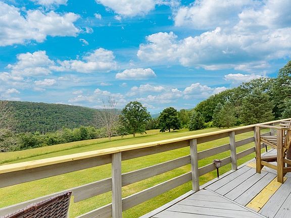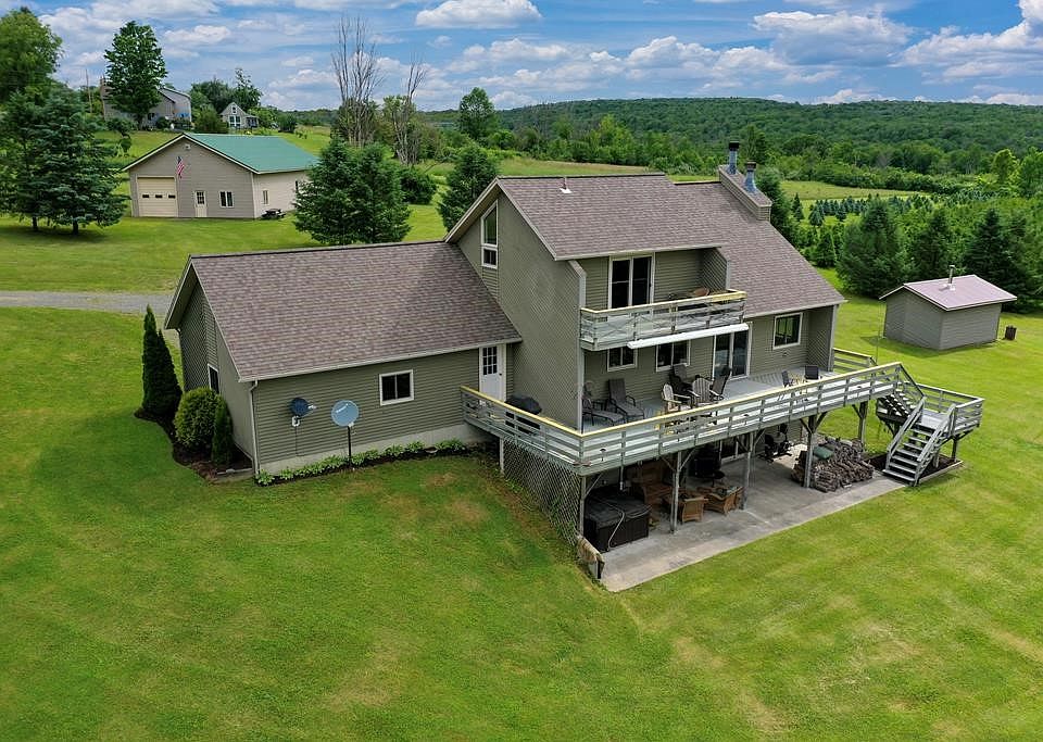 A little piece of paradise - you don't want to miss this one-of-a-kind property. Magnificent view from the front deck. Property has 46.4 acres with a stream, Christmas trees. 32'x54' pole barn with car lift & office, outside wood boiler in shed that stores the wood, newer furnace. Home has four bedroom and three baths. Cathedral ceilings and wood burning fireplace in the living room. Basement is finished walkout with a patio and hot tub. Second fireplace in family room. LOTS of natural light. Seller requests 24 hours to respond. Property borders 1,452 acres of State land. Good hunting. Listing Realtor is the Seller.