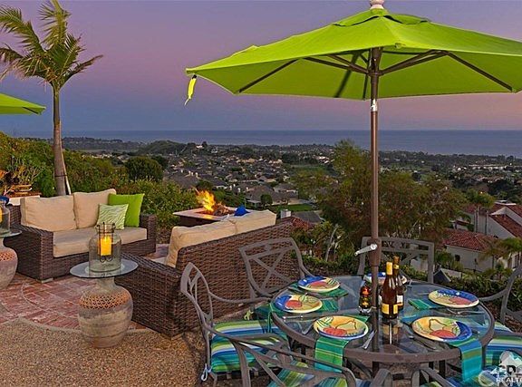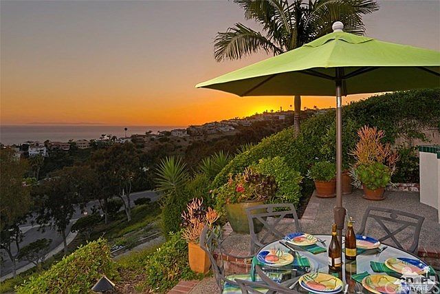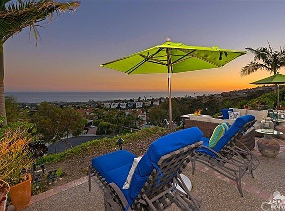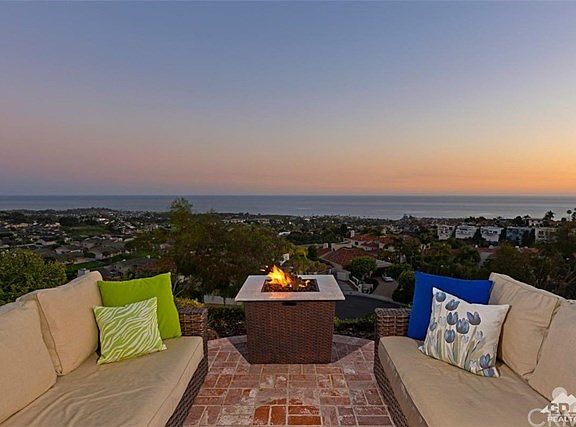 This charming Spanish Villa is situated on a one of the best lots in Palicio Del Mar in San Clemente, with ocean sunset view to Catalina & San Clemente Islands. Designed to capitalize on the VIEW, there is a wall of glass windows and French doors off both first & second stories of the home, with balconies on both levels too. Beamed ceilings, Saltillo tile and thick oak plank floors inside, with red brick and aggregate hardscape outside. Cute kitchen leads to sun room with French doors to side yard garden and fountain. Formal dining room with custom built in buffet server. Living room and den have wall of built in bookcases, with see through fireplace between the rooms. Both bedrooms have vaulted ceilings. Downstairs 3/4 bath has single vanity & shower. Master retreat upstairs has bedroom w/ fireplace, den & bath with dual vanities, spa tub & separate shower. Office upstairs could be built out & converted to bedroom/bath. Freshly painted, new roof, custom gutters, 3 new skylights.