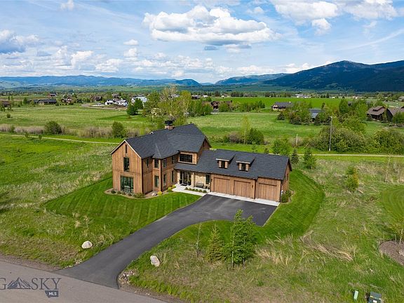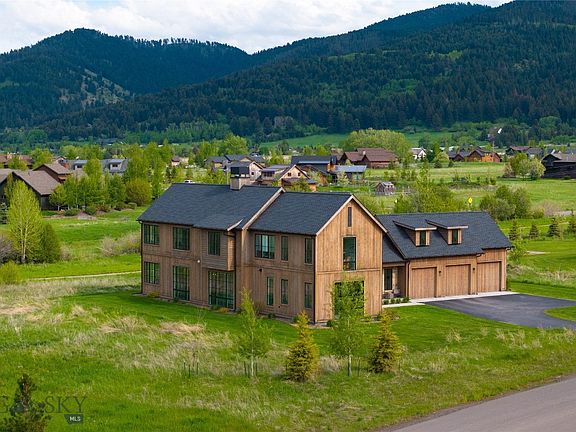 Situated within the prestigious community of Home 40, this extraordinary residence, crafted by Porlier Homes, stands as a true masterpiece. Since its completion in 2020, this 4,191 SqFt home has become one of the community's most coveted properties. Set on a 1.01-acre lot that backs a trail system & seasonal stream, the home is designed to capture the beauty of Montana’s majestic mountain ranges, with floor-to-ceiling windows framing panoramic views from every room. Upon entering through a bespoke glass door, you are immediately welcomed by the warmth of herringbone flooring that guides your gaze toward the grand foyer staircase. The expansive great room & chef’s kitchen unfold before you, each space artfully designed to highlight the uninterrupted vistas of the Bridger & Gallatin Mtn ranges. The home embodies a perfect harmony of unparalleled craftsmanship & sophisticated living, seamlessly blending luxury with nature’s grandeur. The thoughtfully designed floor plan flows effortlessly onto a covered back patio—an entertainer’s dream. With a patio TV for outdoor gatherings & al fresco dining, the space cascades onto a sunken stone patio, complete with a custom wood-burning fireplace & an intimate hot tub retreat for ultimate privacy & relaxation. Inside, the expansive kitchen, dining & living areas are designed for both function & elegance. A dual-sided fireplace serves as a central focal point, offering both gas & wood-burning capabilities. The gourmet kitchen features expansive granite countertops, an oversized island, Dacor & Bosch appliances, and a separate butler’s pantry, ensuring the highest standard of luxury living. The main level also boasts a serene master suite, a dedicated laundry room, a convenient "drop room" for everyday essentials, and a highly organized 3-car heated garage with optimized storage. On the second level, (3) generously appointed bedrooms & (3) bathrooms provide ultimate comfort & privacy. Additionally, a bonus room, a separate office, and a fully equipped gym with mat flooring & mirrored walls create an environment that seamlessly merges function with beauty. Every room offers spectacular views of the surrounding mountain ranges & valley, enhancing the experience of living within this natural sanctuary. This custom residence epitomizes the seamless fusion of modern luxury & the rugged beauty of Montana’s landscape, offering an unparalleled lifestyle defined by comfort, elegance & the breathtaking scenery that surrounds it.