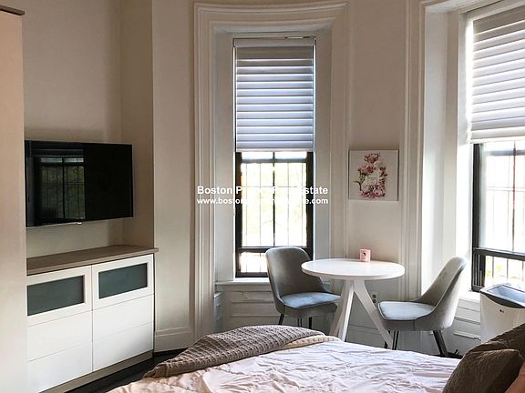 AMAZING OPPORTUNITY to live in the South End in a parlor level, front facing FURNISHED studio with elevator, common laundry and breathtaking ROOF DECK. This unit literally has IT ALL! Shiny dark mahogany floors throughout, updated kitchen with full size stove and refrigerator, gorgeous modern bathroom, decorative fireplace, high ceilings, beautiful crown molding and front facing bay window. Hunter Douglas window treatments, custom California Closets, flat screen TV, and sleek foldable Murphy bed. Tenants are responsible for utilities. Available June 1st.
