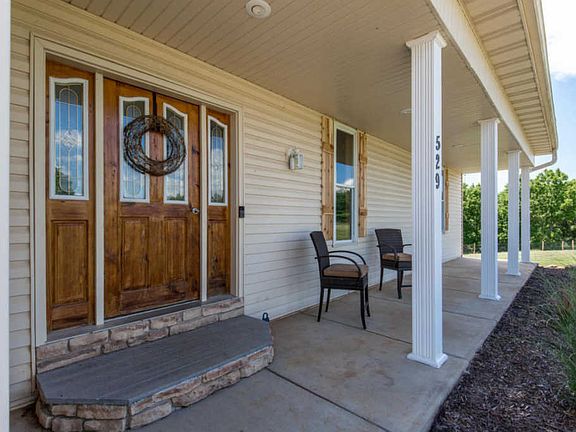 Beautiful home conveniently located between Nixa and Clever. This charming 5 bedroom, 4 bathroom house is situated on 4.6 acres and has a open floorpan and tons of natural light. The adorable front porch is perfect for your morning coffee or reading. Lots of privacy but still close to shops. This home features a large master bedroom with attached on suite with his and her sinks and a large walk in closet. There are an additional two bedrooms on the main level that are good sizes. The views from the kitchen and dining area are stunning overlooking the peaceful acreage. The walkout basement has a nice wet bar & open living space that can easily have multiple uses. There is also a full bathroom downstairs and additional bedroom. Large bonus room on the second level with another full bathroom