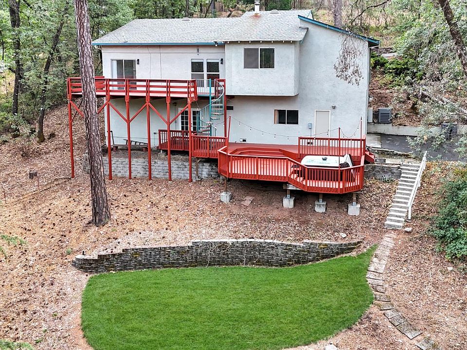 Welcome to 529 Greenwood Rd, Meadow Vista - where peaceful living meets the charm of one of Northern California's most beautiful nature-filled communities. Tucked away at the end of a picture-perfect road,-RV access- this 2,338 sq ft home offers 4 bedrooms plus an office, creating the ideal blend of comfort, privacy, and space. A circular driveway provides ample parking and easy access, while the soothing sound of a waterfall fountain greets you and your guests upon arrival. Step outside to enjoy two well-maintained decks overlooking your nearly one-acre fenced backyard. Unwind under the stars with evening moonlight from your private hot tub, or entertain with friends and family in the generous outdoor spaces and lawn areas. Inside, the home features expansive living and family rooms with room to spread out. The updated primary suite easily accommodates a king-size bed, while two additional bedrooms on the main level provide flexibility for family or guests. On the daylight lower level, you'll find another bedroom plus office space, along with an oversized finished garage perfect for storage or hobbies with. This property offers the best of both worlds just minutes from town for convenience, yet tucked away enough to deliver the peace and privacy that make a house feel like home