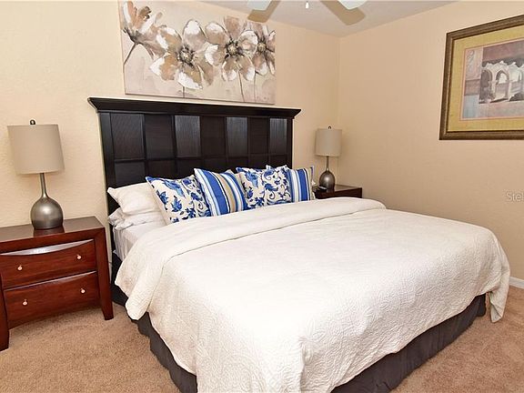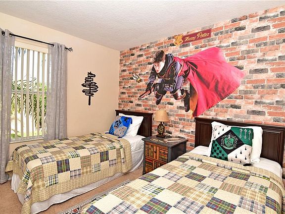 Located on the resort community of Regal Palms, this is a 4 bedroom, 3 bathroom townhouse laid out over two floors. There is a ground floor bedroom, which has it's own front door and can be locked off from the main house - perfect for traveling with grandparents or friends that want a bit of extra privacy. There is a queen bed, armoire with 30" TV, double closet and en-suite bathroom with bath/shower, basin and WC. The main area of the house is open plan with a dining table seating 6, sitting area with large comfortable sectional sofa, flatscreen TV and DVD player and patio doors. The kitchen is compact but has everything you would need for catering at home; electric oven/hob, microwave, dishwasher, double sink with disposal unit and large American style fridge/freezer. Tucked away there is also a washer and dryer. Upstairs there are three further bedrooms and two bathrooms. The master bedroom has a king size bed, chest with flatscreen TV, walk in closet and en-suite bathroom with bath/shower, basin and WC. Bedroom 3 has a Harry Potter theme with twin beds, closet and flatscreen TV and bedroom 4 has a Finding Nemo theme with twin beds, double closet and flatscreen TV. The family bathroom has a bath/shower, basin and WC. Regal Palms has a wealth of on-site facilities including two communal pools, lazy river, water slide, jacuzzi, tiki bar, beach volleyball court, play area, arcade, bar, restaurant, fitness center and spa.