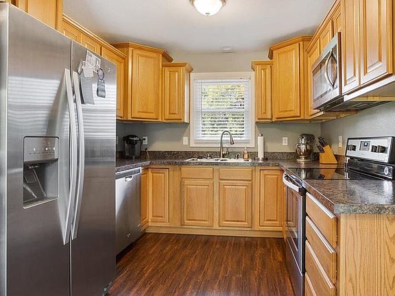 Updates Galore! New carpet, flooring and paint throughout the home. New Kitchen complete with new cabinets, counter tops, and stainless appliances. Unique pallet accent wall in the living room. The bathrooms have been updated, the upstairs bathroom with an onyx walk-in shower. A deck overlooks the fenced backyard with storage shed, trees and access to the Gardner Green-way. The walk-out basement is unfinished offering the buyer potential for additional living area. The laundry hookups are in the basement.