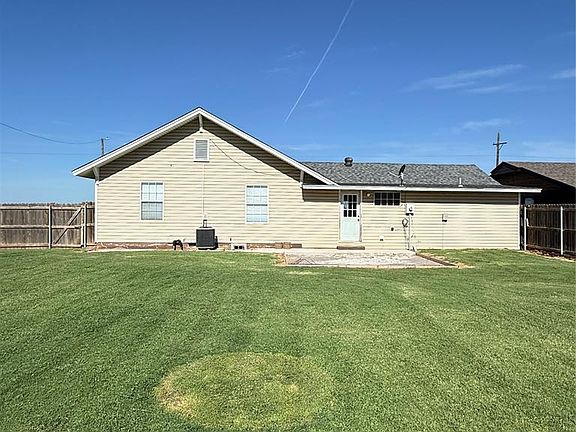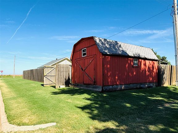 This charming 4 bedroom home has an amazing country view and rock on the large covered porch and enjoy the beautiful Oklahoma sunsets. The kitchen is large, updated appliances with a sink view of a small sunroom, perfect for plants or a play area. Large primarily suite has two walk in closets and large bathroom with plenty of storage. The open floor plan allows for some separation while all being together. Huge corner lot with side street access through the wood fence and a 12 x 20 storage building and lean to for mower. Call for an appointment today.