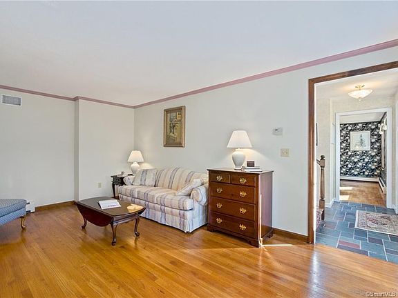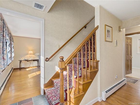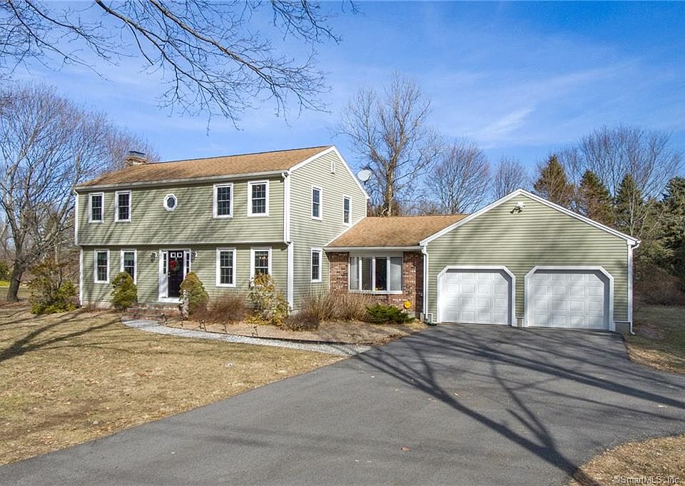 Traditional Colonial with a Sun Filled Interior Spacious formal living room with brick fireplace with oak surround opens to the front foyer and formal dining area with built-in dry bar. Large eat-in kitchen with plenty of custom oak cabinets and an amazing walk-in pantry. Kitchen opens to the family room offering a nice entertainment flow that includes built-ins, ceiling fan, Mitsubishi wall unit AC/Humidifier and a large bow window. Family room has direct access to the 14x14 deck and patio. First floor laundry room and full bath combo on the main level. Generous master bedroom with a sitting area and a walk-in closet. 2 large additional bedrooms with ample closet storage and a full bath completes the upper level. Many recent improvements include newer windows, siding, central air, thermopane windows, security system, and a Connecticut Basement Systems installed 9/2019 which is an entire waterproofing system with transferrable lifetime warranty. Harwood flooring throughout, an oversized two-car garage and a large level yard. Close to Day Pond State Park, walking and biking trails, and highways. A Terrific Buy Schedule your private appointment today