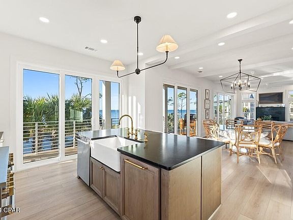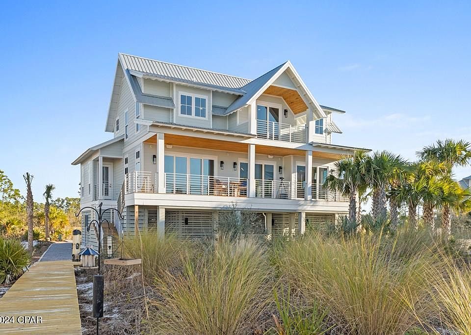 CUSTOM BUILT HOME with Sweeping Bay Views and Direct Beach Access in the Beautiful WindMark Beach gated community! This 4BR, 3.5BA is designed with a coastal aesthetics. This home boasts driftwood-inspired flooring that flows throughout, with a wall of windows & doors that flood the space with natural light and offers breathtaking sunset views. A natural stone fireplace creates a cozy ambiance, while beamed ceilings extend into the dining and kitchen areas. The spacious kitchen features a large island, durable soapstone countertops, GE Monogram appliances, which includes a 6-burner gas cooktop, griddle, and pot filler, surrounded by custom tile backsplash. A DO NOT MISS custom walk-in pantry, with built in beverage refrigerators, floor to ceiling shelving, along with butcherblock countertops. Step outside to the expansive deck, perfect for dining or relaxing while enjoying the bay breeze. The deck features waterproof decking, Bluetooth-integrated speakers, and sleek modern stainless railings for a clean and contemporary look. Included on the main level is a sophisticated primary suite with private sunrise balcony, Carrara marble tile & notable spa-like features taking this home to another level. Upstairs offers a second bedroom with an ensuite bath. Two additional guest rooms and a flexible fourth bedroom that can serve as an office, bunkroom, or playroom. The home features a 3-stop elevator for easy access to all levels. Outdoors, the beautifully landscaped grounds, a private boardwalk to the pet-friendly beaches and St. Joseph Bay. Additional first level amenities include a hot/cold outdoor shower, climate-controlled storage, garage parking, and a full water view outdoor entertaining area. Enjoy neighborhood amenities like a bayfront pool, boat docks, and nature trails, all within a golf-cart-friendly community. Located just minutes from fine dining, specialty shops, and a fitness center, this home offers unmatched coastal living and investment potential.