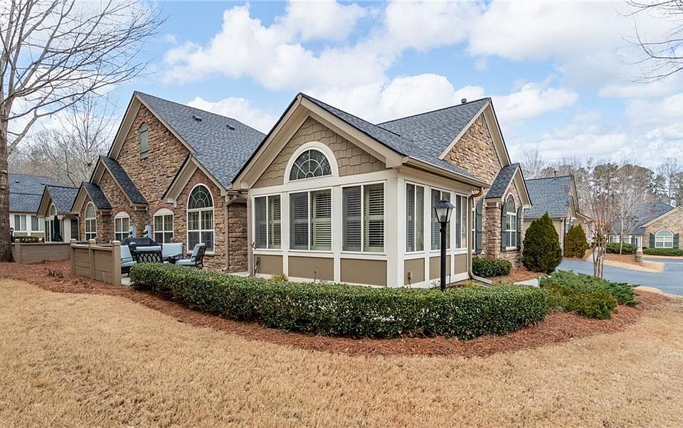 Impeccably maintained home in highly sought after 55+ community Stonebrook Village in West Cobb. This is a hidden gem with units rarely coming on the market in the community. This charming home boasts one of the larger floorplans nestled in the back of the community, offering privacy and a relaxing wooded view off the back patio. The gorgeous chef's kitchen is complete with granite countertops and an abundance of beautiful stained cabinets, a full compliment of stainless steel appliances with an open view to the main living area giving you that desirable open floor plan feel. The laundry room and extra storage is conveniently located off the kitchen and leads to the two-car garage. The open concept dining area is great for entertaining allowing plenty of space for any family gatherings. This is a 2 bedroom floorplan but has additional rooms to fit anyone's lifestyle. There is a light and bright and cozy sunroom, the ideal spot to relax with your favorite book or a quaint conversation area and an additional separate office with French doors that could double as an extra guest room if needed. Features of the home also include a spacious primary suite with sitting area and an owner's suite bathroom with a double vanity and separate shower and an huge walk in closet. You will also love the large secondary bedroom. Additional features include plantation shutters throughout the home, hardwood flooring, two car attached garage, as well as a new roof and newer HVAC units that are just icing on the cake. This active community's amenities include a swimming pool, clubhouse, and an exercise facility. Experience the close-to-everything lifestyle with convenience to shopping, dining, parks and hiking trails and everything else west cobb has to offer, call today for more information !!!