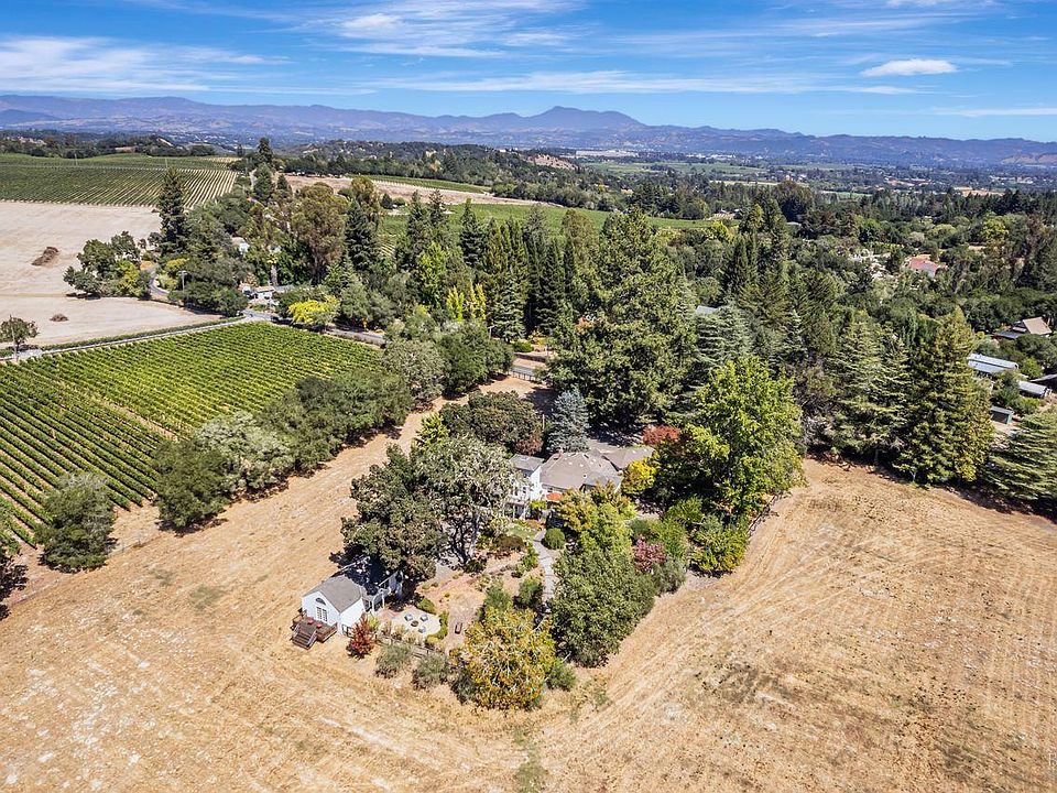 This true legacy property has remained in the same family since the 1930s and is set in the highly desirable Vine Hill region of Sebastopol, renowned for its Goldridge soils within the Russian River Valley appellation. The original farmhouse has been thoughtfully updated and expanded over the years, skillfully preserving its historic character and charm. The delightful kitchen addition is designed with tall ceilings as an architectural counterbalance to the original water tower. The dining room opens to the backyard deck, both featuring expansive westerly views of the enchanting grounds and hills beyond. The peaceful bedroom wing offers serene views. Windows enclose a porch creating an inspiring office space. The detached art studio is bathed in natural light and offers comfortable guest quarters. A spacious pergola, elegantly wrapped in mature wisteria and illuminated by string lights, serves as the perfect setting for gatherings. The enchanting grounds surrounding the home are beautifully landscaped, showcasing grand trees such as Japanese Maple, Oak, Olive, and various fruit trees. Last year, 16-acres of Chardonnay and Pinot vines, originally planted in 1995, have been removed. This alluring, over 19-acre parcel in a timeless setting offers a rare and exceptional opportunity.