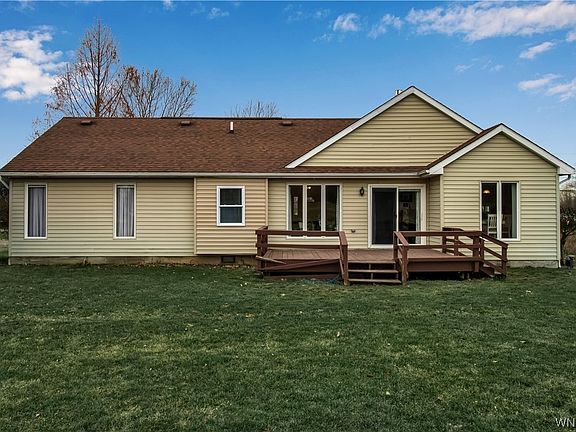 Meticulously maintained three bedroom, two full bath Ranch is nestled on a sprawling 1.5-acre parcel within the Wheatfield school district. The living room features soaring cathedral ceiling, new flooring and gas fireplace adorned with a custom mantle, creating a welcoming & cozy atmosphere. The well-appointed kitchen highlights Corian countertops, tile backsplash, recessed lighting, pantry and newer appliances. The living/dining room transitions to an expansive deck through a slider door, creating an ideal setting for entertaining and relaxing in the tranquil surroundings. The primary bedroom is a haven of comfort, showcasing an updated ensuite with an extra-large soaking tub, rain shower head, distinctive modern bathtub faucet, spacious walk-in closet, new recessed lighting and window. This property boasts generously sized rooms, first floor laundry with new cabinets, A/C, pocket doors, updated electrical, remodeled baths and new high-end flooring throughout. Additional perks include the 2.5 car attached garage with permanent stairs to the attic and a shed, providing an ideal solution for additional storage needs.