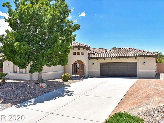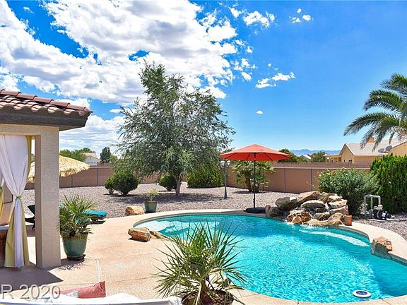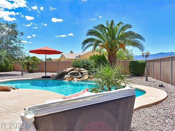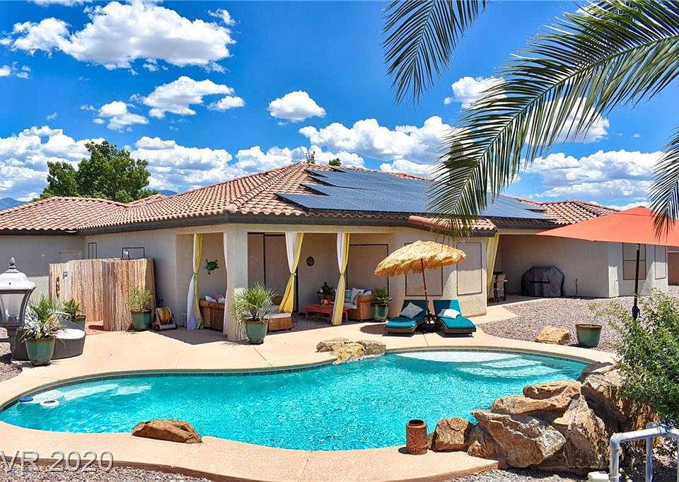 Grand entrance, SOLAR, courtyard + casita, in-ground pool with waterfall, & stunning finishes in the nearly 3k sqft main house! Open kitchen w/granite tops, pantry, eating nook, & breakfast bar. Gorgeous master suite with accent windows, walk-in shower with rain feature, dual sinks, & Jacuzzi tub. Two covered back patios, fully-fenced backyard, & landscaping finished to perfection. Gunite custom pool w/waterfall, 30x14, heated, & wrapped with cool deck! Solar panels installed 1 year ago, solar screens, gated entry, & stunning sunsets. 400 sqft casita offers kitchenette, accent windows, full bath, & gated front courtyard. Valley has 2 wineries, 2 golf courses, 2 race tracks, hiking/biking/horse trails, easy access to Cali, & just 45 min to Las Vegas!