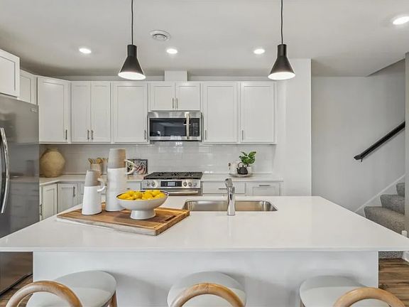 Kitchen: Features a large center island, quartz countertops, stainless steel appliances, and LVP flooring