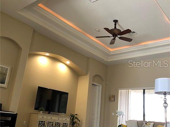 - Interior Features: Ceiling Fans(s), High Ceiling(s), Living Room/Dining Room Combo, Master Bedroom Downstairs, Split Bedroom, Walk-In Closet(s), Window Treatments, Open Floorplan, Solid Surface Counters, Eating Space In Kitchen, Tray Ceiling(s), Thermostat