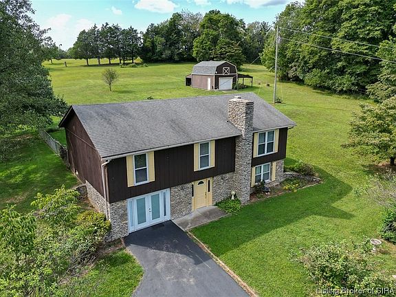 5 ACRE FLOYD COUNTY HOME GARAGE & BARNS Custom one-owner 3 BR - 2 1/2 bath cedar and stone raised ranch with full finished walkout basement in a beautiful country setting with a 3-car detached 24 x 40 metal garage built 2010, and two barns - a 16 x 28 frame barn built 1980 with loft and lean-tos and a 30 x 40 metal pole barn built 2007 with concrete floor on 5 acres with a pond. Features include covered deck, fenced yard, Akers hot tub, replacement windows, decorative wishing well & 1000 gallon LP gas tank. Easy access to schools. Located 1 1/2 miles off US Hwy. 150 just minutes from I-64 near Old Vincennes Road in Greenville Township, Georgetown mailing address. Buyer to reimburse Seller for remaining fuel stored in LP gas tank at current market value. Possession at closing.