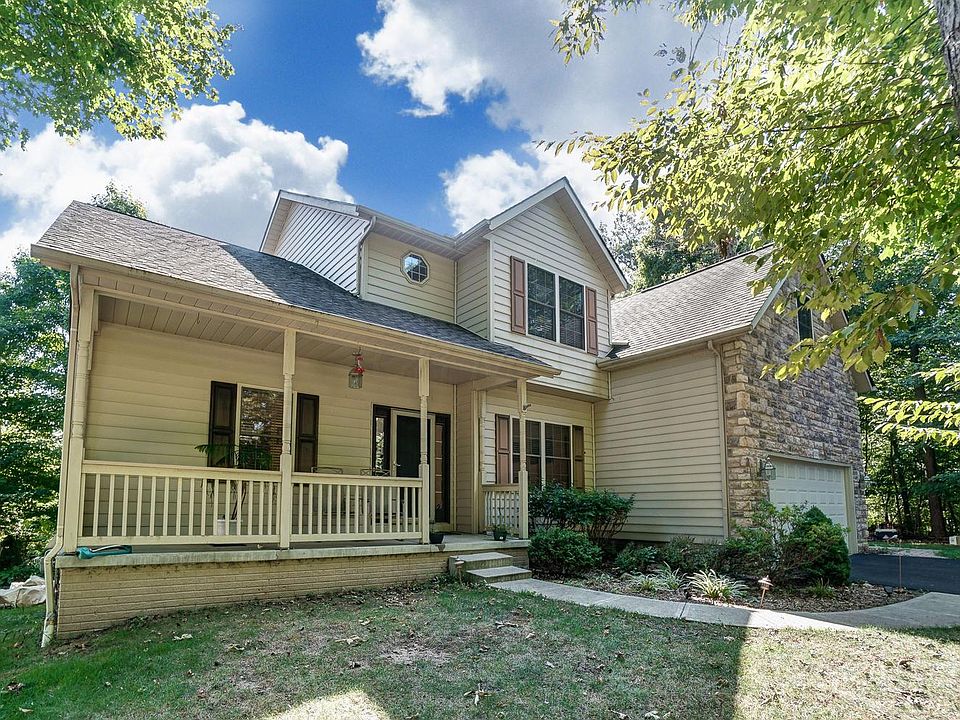 This is a fabulous family home. Nestled in the woods and backs up to a ravine with a stream. Five bedrooms and three full baths and one half bath. Situated on a double lot, with lots of mature trees, in the desirable Woods at Jefferson. Home features a two story great room, entry level includes a first floor master bedroom, den, loft, dining room, laundry room and eat in kitchen. Lower level includes a entertainment area, gas fireplace, bedroom and bath. Two exterior decks that have been newly power washed and stained, with beautiful views of the wooded lot and stream. The hot water heater, furnace and central air are new. New top of the line 4 Ton A/C/Furnace. Gutters have leaf filter system. New driveway installed this summer. Come and see this beautiful.