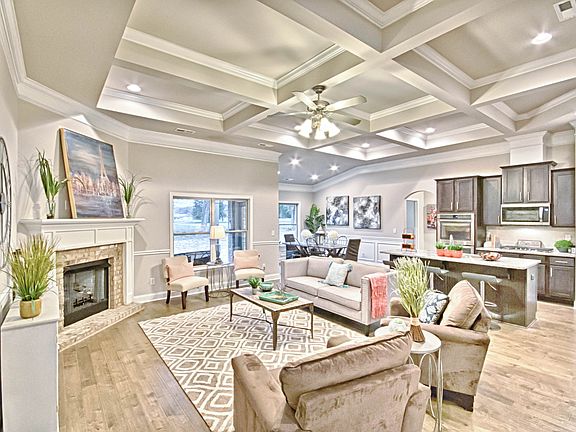 Welcome home to the Firestone IV! The opportunities are endless with this wonderfully designed single level home. Greet your guests at the covered front porch and invite them into the comfort of your home and wow them with the beautiful coffered ceiling in the great room. You will love spending time in the eat in kitchen & family room which flow seamlessly together providing the perfect space to be with friends & family. As you find yourself cooking in your beautifully laid out kitchen everyone will congregate around the huge granite island creating the space for wonderful memories. Or take it right outside to your covered porch where you can watch a game on a cool night by your optional exterior fireplace. Retreat to your first floor master suite with vaulted ceiling, indulge yourself to a relaxing bath in the soaking tub and rejoice in the size of your closets! The other 3 bedrooms in the home are spaced out wonderfully, providing maximum privacy for your master suite. Don't worry, there is plenty of space for your cars and toys in the 3 car garage. You have arrived! Options and upgrades shown in photos may not be included in price.