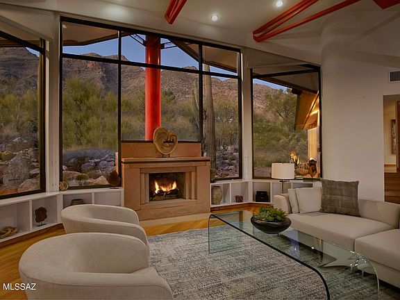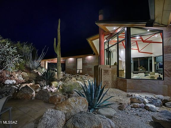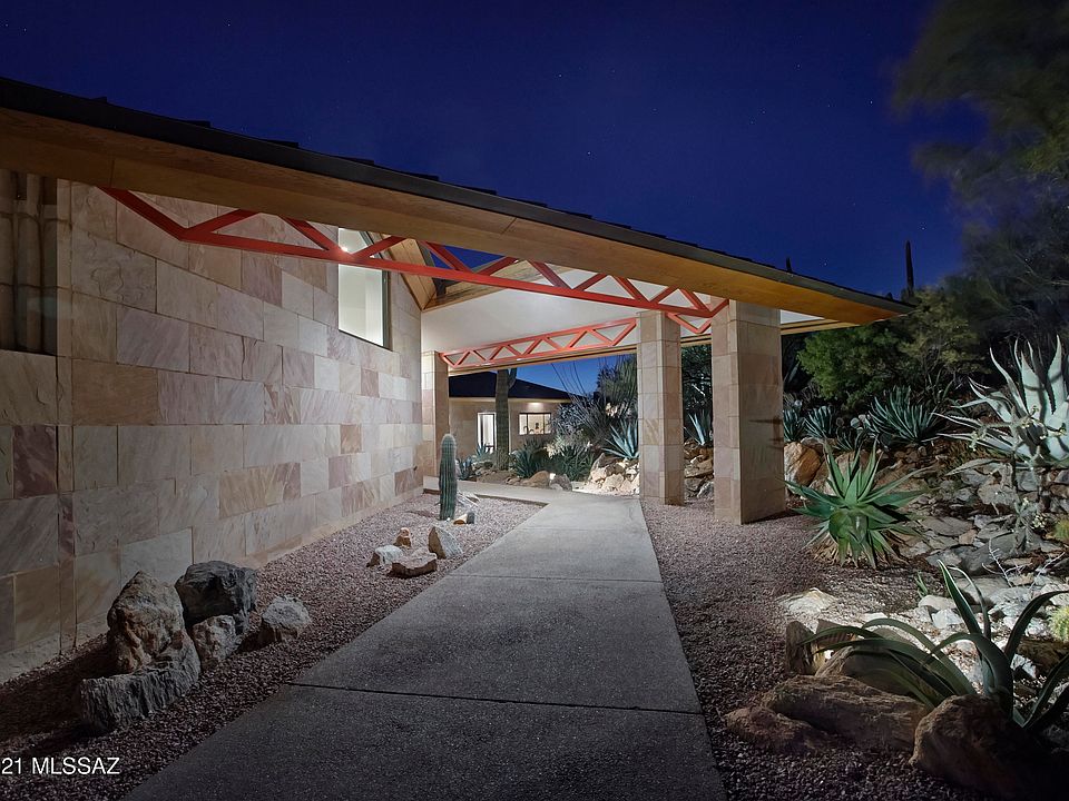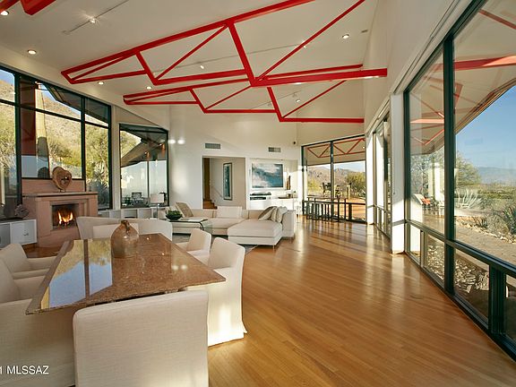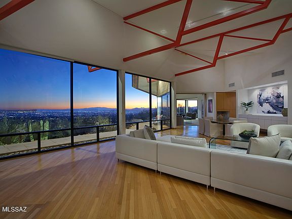 Situated on arguably the finest view lot in the Foothills at the top of Skyline C.C, with unobstructed 180 views that encompass the entire Tucson valley & majestic Catalina Mountains, sits this absolutely stunning European contemporary work of art designed by noted architect Ron Fridlind. Way ahead of its time for its cutting edge design & luxurious contemporary finishes in Tucson, this home exudes its owners European roots & love of the AZ desert showcased by clean lines and walls of windows framing dramatic views in every direction. The flagstone covered exterior combined w/the metal roof, commercial grade windows & dramatic red artistic steel beams give the home a sleek modern aesthetic yet blends seamlessly into the natural desert landscape to give an understated elegant feel. Solid oak floors add warmth to the impressive living room while the red chimney draws your eyes upward to stare at the mountains towering overhead. Three en-suite bedrooms plus a den provide for a flexible floorplan with jet liner views from every room. The sleek modern European style gourmet kitchen offers newer stainless appliances, ample storage, eat in breakfast nook and opens onto a private patio for morning coffee. Exquisite specimen cactus have been added to the property to enhance the feel of the natural desert and provides a beautiful landscape to enjoy from either of the two patios. This home is being offered For Sale for the first time and has been priced to take into consideration some updating that a new owner might wish to do. Please submit offers knowing home is being sold As-Is and the owner will need a minimum of 48 hours to respond to offers as they reside overseas.