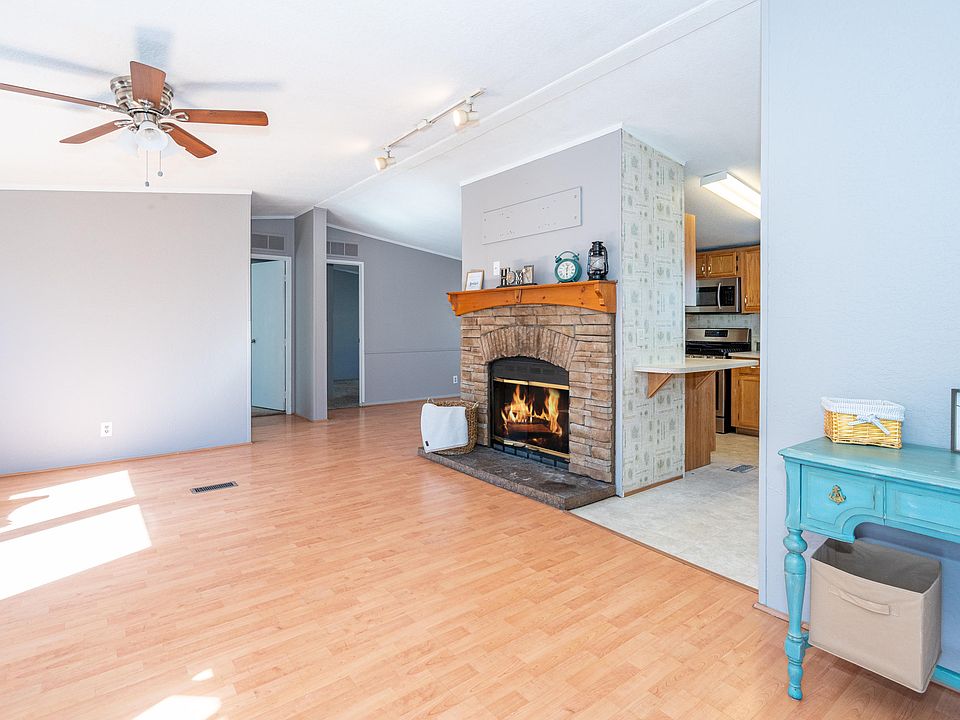 Welcome Home! This home has been freshly textured & painted inside. It features 3 bedrooms & 2 baths. The living room is bright and light and open, with wood-looking laminate, & a fireplace to relax in front of. Two skylights in the home add to the abundance of natural light. The kitchen has plenty of storage space, including pull-outs & a pantry. This cute home has a split floor plan, with the master featuring a large walk in closet, as well as a roomy bathroom with dual sinks, a shower, and a large garden tub for relaxing and unwinding after a long day. The yard is low maintenance, featuring freshly added landscaping rock. There is plenty of parking--with the 2 car garage & up to 4 additional spaces. The neighborhood is conveniently located near a park, restaurants, & the mall!