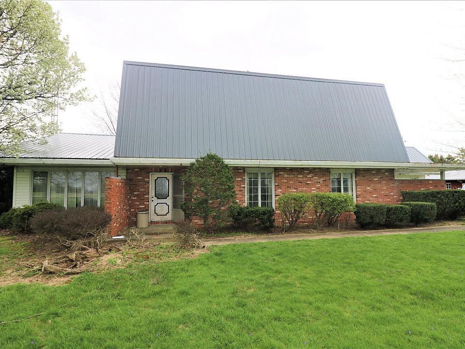 So much Character and Potential in this 3/4 bedroom, 2.5 bath country home sitting on a beautiful 6 acres with stocked pond and storm shelter! This open floor plan includes a kitchen with large island and gorgeous brick fireplace. The first floor master suite boasts adjoining office and on-suite full bath. Other features include stained glass window, spacious rooms with lots of storage, additional 2 bedrooms and full bath upstairs, covered front patio, enclosed back porch, laundry chute, etc. The attached garage includes pull down attic storage, large closet, and toilet. The 28 x 48 pole barn has wood burner, propane furnace, water, and 14 x 48 lean to. Lots of room for entertaining inside or out...and don't forget about the great garden location! Entertainment center stays.