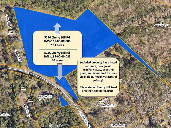 Beautiful secluded property -- private gated entrance, CLEARED with a new gravel road/driveway, new pond, and buffered by trees on all sides. Roughly 8 acres of privacy in the Low Country! Ready for your private rural estate, horse farm, or hunting land. City water available on Cherry Hill Road; SEPTIC PERMIT IN HAND, no HOA. Property consists of two parcels - TMS 165-00-00-088 and 165-00-00-085 totaling 7.93 acres. Property is adjacent to roughly 1,800 undeveloped wooded acres behind the property (currently under a conservation easement) and the beautiful Elliott Estates subdivision, with large multi-acre lots, on the right.