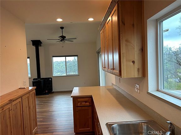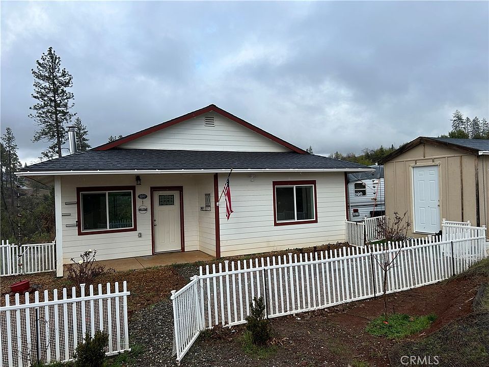 Private setting and like new one bedroom home on 2.99 acres with beautiful sunset and valley views built in 2023, vaulted ceiling in living and dining room with ceiling fans, mini-splits for heat and air plus a cozy woodstove, knotty pine cabinets with granite counters, laminate flooring in living, dining and kitchen, 12 x 10 finished storage building, 400 amp meter panel with 2-200 amp main breakers and additional distribution space in the main panel also previous home lost in the Camp Fire so with town of Paradise approval a second home could be built using that septic and leach field which should be inspected by a qualified septic company, water provided by Paradise Irrigation district. Beautiful mural on concrete retaining wall by Shane Grammer