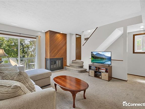 Fully furnished 2 bed 3 bath townhome pet friendly and very stylish This beautifully maintained end-unit boasts an inviting open-concept layout, featuring brand new windows and sliding doors throughout, along with an expansive owner's suite. As you enter the naturally lit living space, you'll be captivated by the distinctive corner fireplace adorned with wood accents and the first of three balconies. The living room seamlessly flows into the kitchen and dining area, showcasing stunning hardwood floors, modern white cabinetry, and easy access to a side deck perfect for grilling and relaxation. Make your way past the convenient half bath on the main floor and ascend to the impressive owner's suite, which includes its own private balcony, soaring vaulted ceilings, a luxurious ensuite bathroom, double closets, and a handy laundry area.