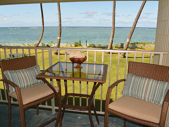 Oceanfront condo with amazing ocean and white sandy beach views right outside your door. Enjoy watching the waves crash from your covered balcony. Spacious 1/1 has large living area, full kitchen, huge bedroom and two separate vanities on both sides of the bathroom. Paradise awaits at Pats at Punaluu, perfect for a vacation rental (we have 8 months of excellent rental history)or staycation when you need to get out of the hustle and bustle. (Discuss rental options) Huge outside recreation area for lounging and dining at the waters edge, steps away from white sandy beach or take a dip in the refreshing swimming pool. All newly remodeled and comes furnished.