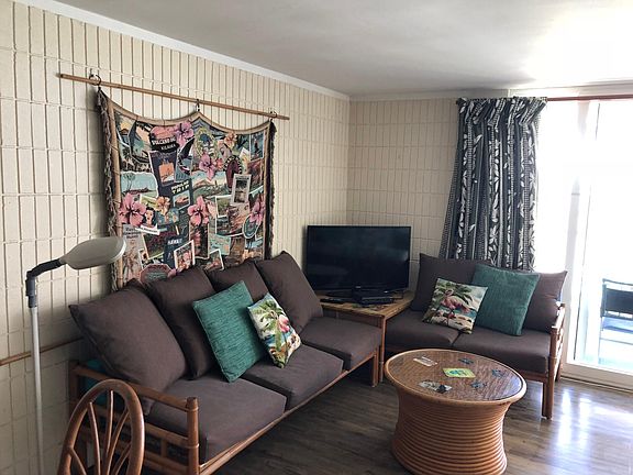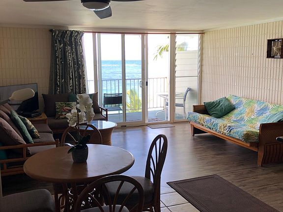 Beachfront condo available October 4. Furnished one bedroom at Pat's at Punalu'u overlooking the ocean. King size bed in bedroom plus two twin day beds and a full size futon in living room. Updates kitchen with dishwasher. Washer, dryer and parking stall included. Minimum lease 6 months. Sorry no cats, dogs or smoking. Fitness room, bbq and swimming pool overlooking the ocean. Owner pays cable internet sewer water, tenants pay electrics and phone