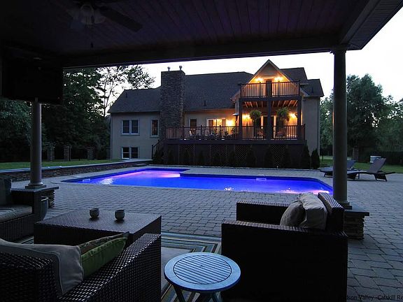 Pure luxury from this lavish Kingston mini-estate. A stone laid driveway leads to the impressive stucco and stone exterior enhanced with mature, manicured landscaping. A bold contemporary interior of high pitched and peaked ceilings make the rooms soar. All detailed hard wood floors in the main living areas are accented with raised panel trim. The kitchen was designed for entertaining, all Quartz counters with long breakfast bar, commercial gas cook-top, built in range and wet bar. Just off the kitchen is the expansive deck overlooking the resort-like pool area with outside kitchen, fire pit and cabana. The master suite is on the first floor, offering a huge bath walk-in-closet and access to the deck that overlooks the pool area. Two more bedrooms and a laundry room complete the first floor. Second floor was added in recent years, there is a family room/den with loft, two more bedrooms and another custom bath with soaking tub. Both bedrooms have high vaulted ceilings and their own private balcony, one looking toward the front and one overlooking the pool. The home has too may amenities to list, a must see to appreciate.