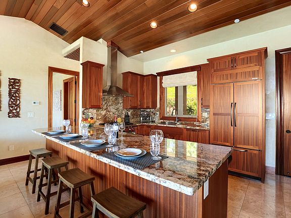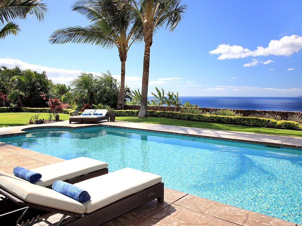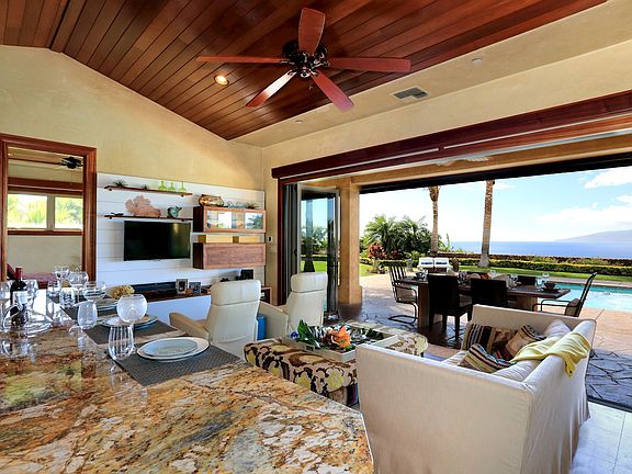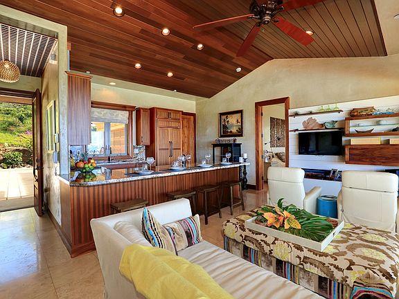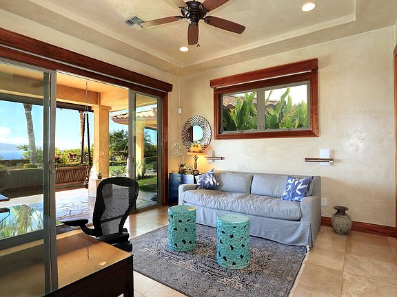 Grab your Opportunity! Accessed by a gated entry and long private driveway, this unique offering is a beautifully upgraded 988 interior sf and extensive covered lanais, with two additional pool cabanas, pool, spa, and two car garage, located on a private acre with mature and lush tropic landscaping. The cottage boasts central air, 2 bedrooms and full baths, an outdoor shower, granite countertops, high end finishes and appliances, monkey pod wood cabinets, and La Cantina folding doors that open fully to a solar heated pool, spa, grassy yard and tropical flower beds. Enjoy the amazing ocean view and sunsets over Lanai form the porch swing. The 2 detached, professionally decorated pool cabanas have air conditioning, La Cantina folding doors, separate half baths with outdoor showers attached for both privacy of an office or guests. Pick your own bananas and citrus, and enjoy the lovely landscaping with extensive tropical flowers. Located close to the walking path, minutes from the Launiupoko beach park, and the restaurants, shops and conveniences of Lahaina town. This home comes professional decorated and fully furnished, and ready to move right in! This property is unique in Launiupoko and truly must be seen to be appreciated.