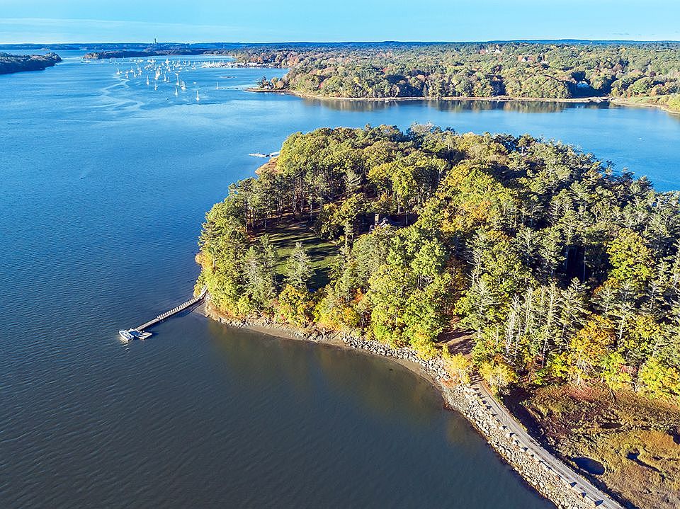 This spectacular Shingle-style home is located on over 5 acres of privacy with 1000± feet of water frontage and a private dock. Offering stunning easterly views, the property is accessed by a private causeway through acres of peaceful and picturesque conservation land. Within the 3000± square feet there are four bedrooms, five baths, including an in-law apartment with its own kitchen. Completed in 2006, great care was used in designing and building this home using architectural salvage materials adding character and charm to its interior. The open floor plan with two fireplaces opens to a covered wrap-around porch with its own exterior fireplace and grilling area. The finished lower level includes a recreation room, a wine storage room, and full bath and a sauna. The beautifully landscaped grounds feature colorful gardens all season long with extensive stone work throughout the property, all surrounded by natural woods. Enjoy convenient island living without getting on a boat, just 10 minutes to shopping and 30 minutes to Portland or Brunswick. The Harraseeket River offers an ideal playground for small boats with the protected harbor of South Freeport and access to Casco Bay just around the bend.