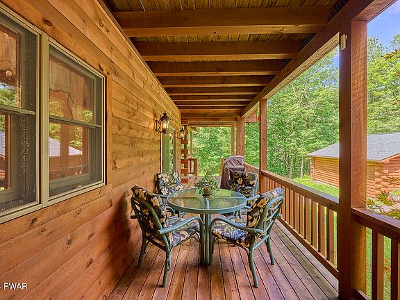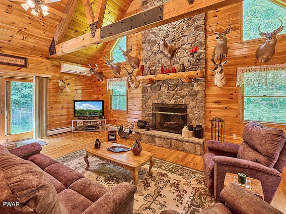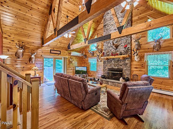 Stunning Log Sided Contemporary! A long private driveway leads to this beautiful log sided home that boasts an open floor plan with vaulted ceilings in the living room a stone fireplace and exposed beam, sliders that lead to a fenced in back yard, a lovely dining room with sliding doors that lead to the front covered porch, country kitchen with plenty of cabinet space, 2 bedrooms and a full bath on the main level, with the primary suite on the 2nd floor that has 2 large closets. Need more living space? The finished basement with high ceilings has a nice family room, spacious laundry room with plenty of storage space and a workshop! There is also a detached 2 car detached garage with attic storage and electric! Set on 20+/- acres with a seasonal stream, this is a wonderful country escape. Only minutes to the charming hamlet of Narrowsburg and the Delaware River. Welcome Home!