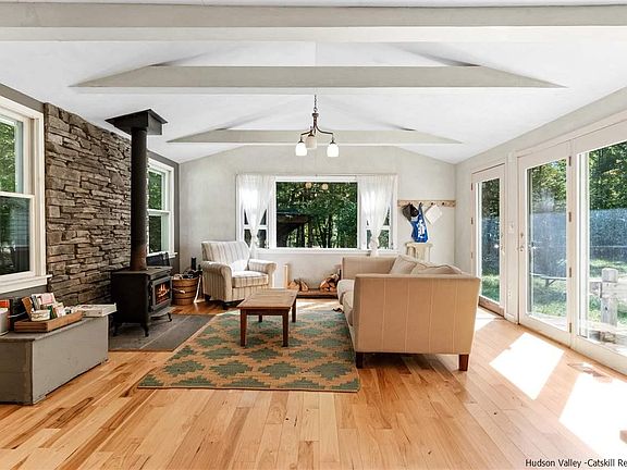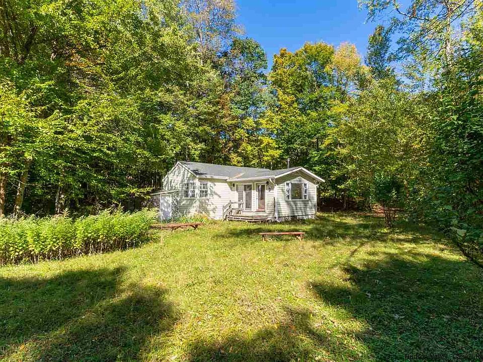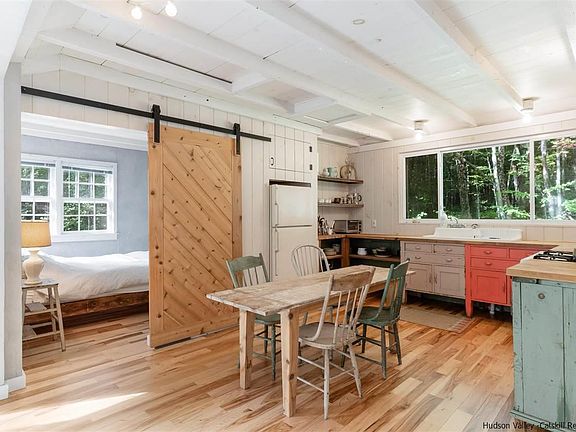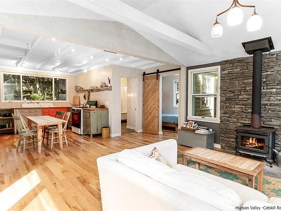 HIGHEST & BEST DUE: 10/4 by 12pm. Thoughtfully curated Bungalow perfectly situated in the hills of the Catskills. A country retreat just 2.5 hours from NYC, 30 min to Woodstock and 30 min to Hunter/Windham Mtn. Using salvaged materials and flea market finds, this one of a kind home was renovated by the renowned & featured Jersey Ice Cream Co. The interior was remodeled around 2015 with updates to the flooring, plumbing, kitchen, bathroom, custom cabinets and furniture (included). As you enter the front of the home you’re welcomed by an open concept, exposed beams, reclaimed vintage wood ceilings, and a charming country kitchen with a generously sized farmhouse sink, custom cabinets, furniture, and island that is well integrated with the living room accompanied by a wood stove. Bathed in light from the adjacent rooms, a farmhouse table made from reclaimed wood and antique chairs create a divider between the kitchen and living areas welcoming conversation and guests. Set under a sunlit window, a salvaged clawfoot tub provides a peaceful place for a soak in the charming bathroom. The comfortably sized primary bedroom includes additional antiques including a built-in headboard fashioned from an old farmhouse door and cut to fit around the window. The cozy cabin-like guest room has a built-in shelf, bedside table, and hook rack maximizing the space. Outside you’ll find seclusion & privacy on 6 acres and access to the creek across the road.