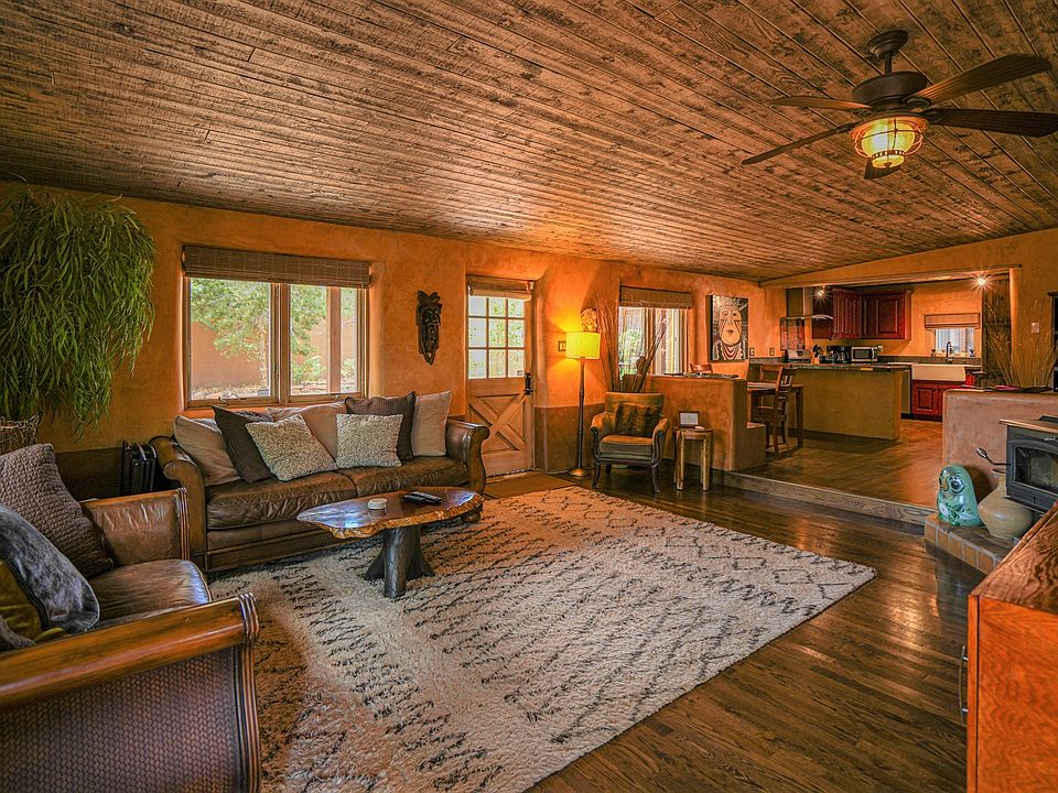 Only a short 20-minute drive away from Santa Fe plaza on all paved roads lies an exceptional Adobe home and casita (casita built in 2019) which is a current producing investment opportunity that is generating income via AirBnB rental. This property features charming rustic doors that lead to a courtyard entrance, a spacious portal, fruit trees, and a serene back deck offering breathtaking views of the Sangre De Cristos to include Shaggy Peak. Inside, you'll find an open floor plan, plaster walls, and beautiful hardwood floors. In addition to its main house is a 1bed/1 full bath casita with kitchen, living room, covered deck/seating area and yard with a fire-pit. This Casita offers full privacy from the home with its own parking and entrance pathway. Also included is a PV solar system and covered parking for the main house. This wonderful Home and Casita has charm that never ends!