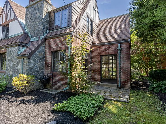 The half-timbered wood & stucco exterior, steeply pitched gables, high-rising clustered chimney, and single-paned windows invite, finding architectural influences of 16th century England.